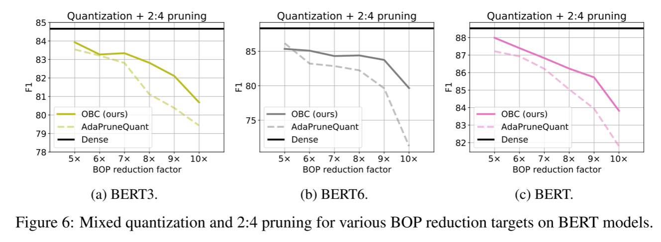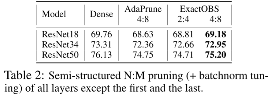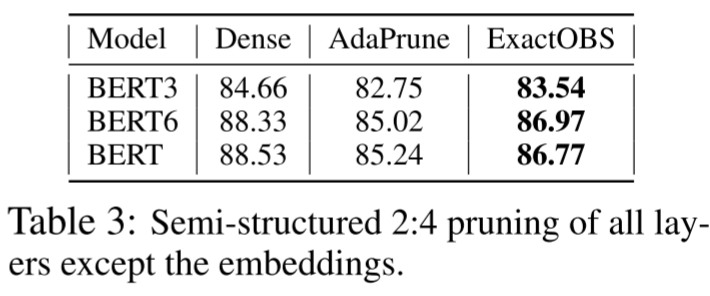 接下来,我们研究我们的方法在通过 N:M 模式实现半结构化稀疏性方面的性能。具体而言,我们在 ResNet 模型上与 AdaPrune(带有批量归一化调优)[18] 的 4:8 结果进行比较(见表 2),并在 BERT 模型上进行 2:4 比较(见表 3)。我们强调,ExactOBS 在相当严格的 2:4 模式下(该模式已在 NVIDIA 硬件上得到良好支持),匹配甚至略微超过了 AdaPrune 的 4:8 结果。此外,在 BERT 模型的 2:4 比较中,ExactOBS 实现了 1-2% 的更高 F1 分数。