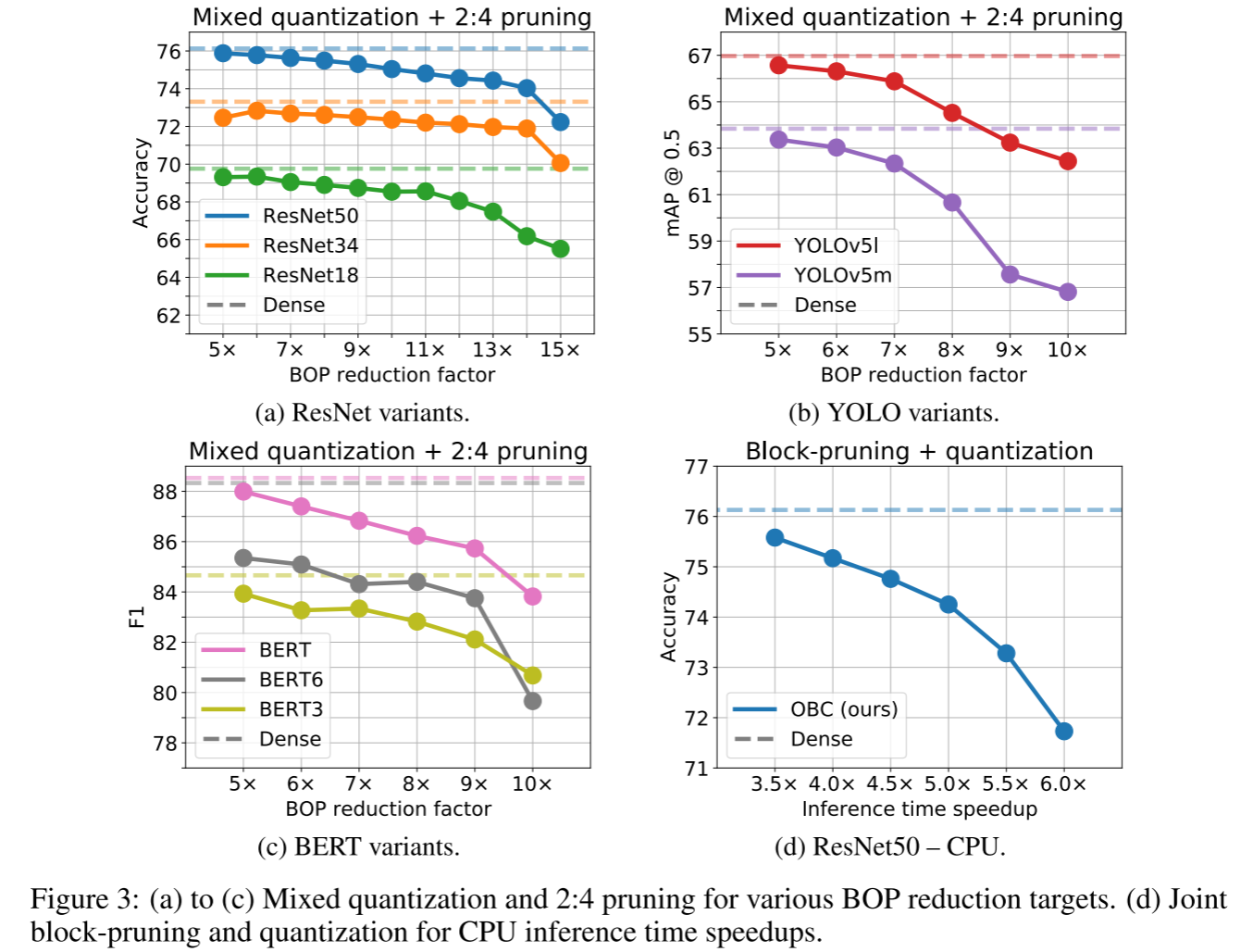 最后,我们探索一个类似的场景,但目标是在 12 核 Intel Xeon Silver 4214 CPU 上实现实际的 CPU 推理加速 —— 使用 DeepSparse 推理引擎 [35, 22],该引擎支持联合 8 位量化和块大小为 4 的块稀疏性。在这种情况下,我们使用真实的逐层计时数据(批量大小为 64),如 [9] 中所述。每层有 30 个可用的块稀疏性目标,以剪枝 10% 剩余权重的步长递增,所有这些目标都进一步量化到 8 位。稠密 8 位模型的基准加速约为 2.7 倍,在此基础上,稀疏性加速大致呈乘法效应。图 2d 显示了 ResNet50 和几个(实时)加速目标的结果 —— 我们实现了 4 倍和 5 倍的(实际)加速,精度损失分别仅为 1% 和 2%。这些是该场景中的第一个完整训练后结果([10] 的作者仅执行了训练后 4 块剪枝,随后在整个 ImageNet 数据集上进行了 5 个 epoch 的 QAT),并且它们展示了非常令人鼓舞的精度 - 加速权衡。