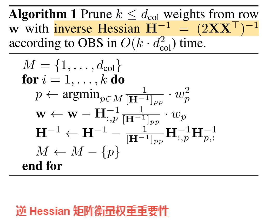 算法 1:根据 OBS,在O(k⋅dcol2)时间内从行 w 中剪枝 k ≤ dcol 个权重,其中逆 Hessian 。