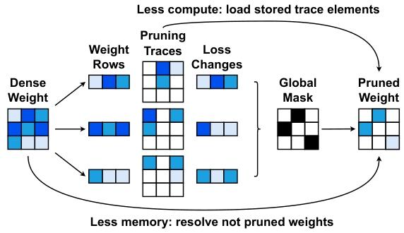 这些见解的结果是,我们可以独立处理每行:按顺序剪枝所有权重,同时始终记录相应的损失变化\( \delta \tilde{L_{p}}=w_{p}^{2} / [H^{-1}]_{pp} \)。最后,我们知道所有d个权重的\( \delta L_{p} \),然后可以通过按顺序选择值最低的权重,简单地确定OBS在完整矩阵上会选择的全局掩码,仅需\( \Theta(d) \)的额外内存。我们注意到,一旦已知逐行掩码\( M_{i} \),就可以通过相应的组OBS公式[21]直接求解剩余权重的最优更新:\( \delta_{M_{i}}=H_{:, M_{i}}^{-1}((H^{-1})_{M_{i}})^{-1} w_{M_{i}} \)。在实践中,这将比简单地重新运行算法1中的迭代剪枝过程快得多。或者,如果有足够的CPU内存,可以将每行的完整剪枝轨迹(即每次单独剪枝步骤后的完整权重向量)保存在CPU内存中,最终只需重新加载对应于全局掩码的条目。这需要\( O(d_{row} \cdot d_{col}^{2}) \)的额外CPU内存,但避免了第二次计算以重建未剪枝的权重,因此速度更快。图1可视化了上述两种选择。
