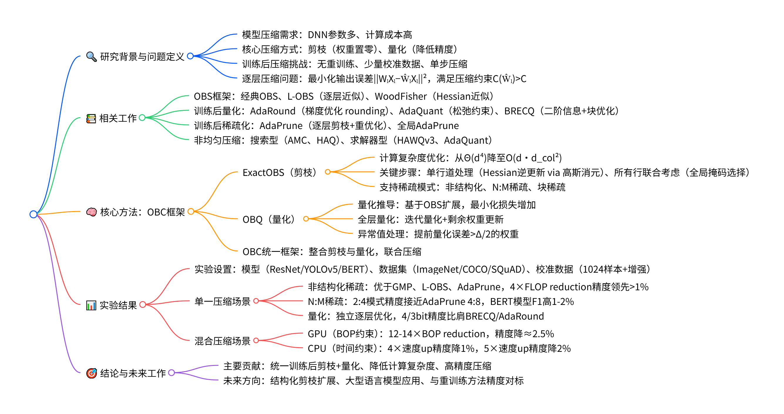 本文提出了一种名为"最优脑压缩"(OBC)的新型训练后神经网络压缩框架,能够高效统一地处理权重剪枝和量化问题。该框架基于经典最优脑外科医生(OBS)方法,通过创新算法将其计算复杂度从O(d⁴)降低到O(d·d_col²),使其适用于现代大规模神经网络。实验表明,OBC在图像分类、目标检测和语言建模任务中显著优于现有训练后方法,并能实现剪枝与量化的复合压缩。例如,在GPU上实现1