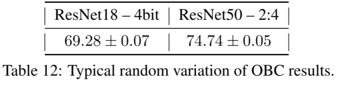对于固定的校准数据集,ExactOBS 算法是确定性的。对于 ResNet 模型,校准数据集上应用的数据增强以及批量归一化调优(使用随机采样的批次)会添加少量额外的随机性;对于我们考虑的其他模型,除了校准数据集的初始采样外,没有其他额外的随机性。为了评估我们方法的结果受这些随机因素影响的程度,我们将 ResNet18 量化到 4 位(对称逐通道),并将 ResNet50 剪枝到 2:4 模式,每种情况使用 5 个不同的种子,并报告均值标准差,如表 12 所示。