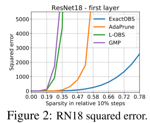 我们首先进行非结构化稀疏性实验,将其与全局幅度剪枝(GMP)[46]、近似逐层 OBS 方法 L-OBS [6] 以及训练后剪枝最先进方法 AdaPrune [18] 进行比较。作为合理性检查,我们在图 2 中检查了我们的方法在逐层平方误差方面是否提供了更好的结果 —— 将 ResNet18(RN18)模型的第一层剪枝到不同的稀疏性。在该指标中,ExactOBS 的性能远远优于 AdaPrune,而 AdaPrune 又显著优于其他两种方法。