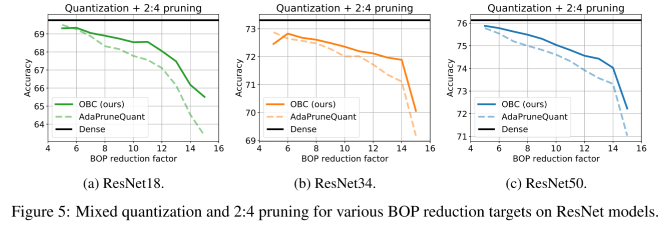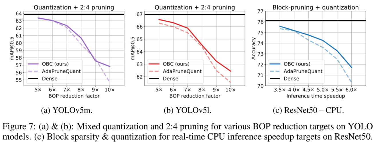 在主论文中,我们专注于量化和剪枝的独立比较,因为现有方法通常仅设计用于单一压缩方法。在本节中,我们另外提供了我们 GPU 和 CPU 场景的复合比较 —— 这些场景结合了稀疏性和量化。具体而言,我们通过在我们的混合设置中用最佳独立逐层剪枝和量化方法(分别为 AdaPrune 和 AdaQuant)替换 OBC,构建了一个强大的基线。现在我们在图 5、6 和 7 中提供了主论文图 3 中所有实验的详细比较。