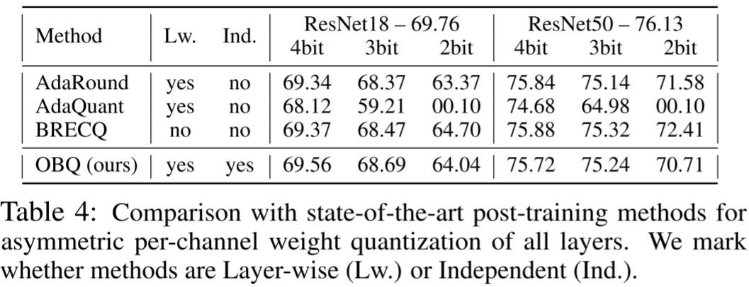 表 4 所有层非对称逐通道权重量化的最先进训练后方法比较。我们标记方法是否为逐层(Lw.)或独立(Ind.)。