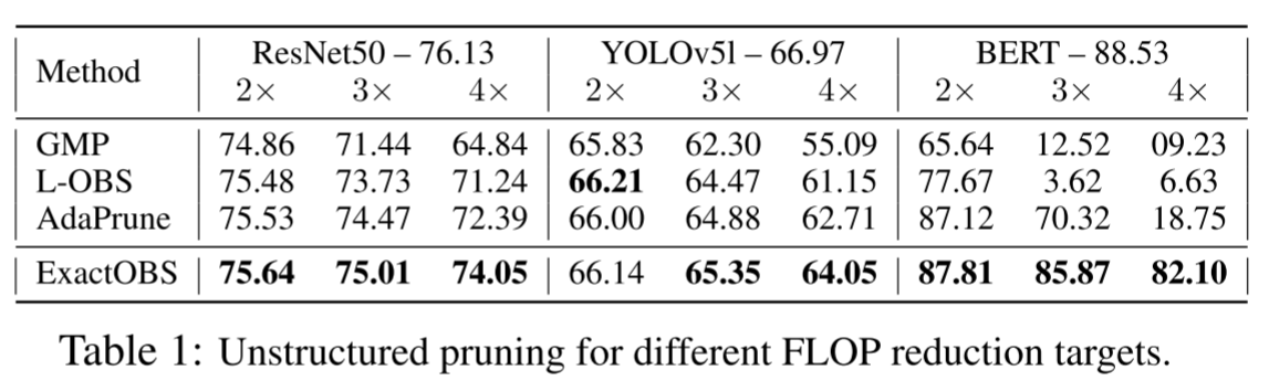 接下来,在表 1 中,我们将注意力转向将各种模型剪枝到给定的 2 倍 - 4 倍 FLOP 缩减目标的实际问题,应用上述逐层目标稀疏性优化技术。我们的 ExactOBS 总体上表现最佳(除了 YOLOv5l 的 2 倍 FLOP 缩减 —— 所有方法在 mAP@0.5 方面表现相似),并且在 4 倍 FLOP 缩减时,与次优方法的差距甚至超过 1%。有趣的是,在难以剪枝的 BERT 模型上,ExactOBS 似乎是在较高缩减目标下仍能产生合理结果的唯一方法。对于 BERT 的 3 倍和 4 倍 FLOP 缩减(所有方法的性能下降都 > 2%),我们另外评估了我们的结果与更强大(但也更昂贵)的后处理方法全局 AdaPrune [10] 的兼容性。尽管这种全局优化技术能够恢复损失的精度,但 ExactOBS 模型仍分别保持 > 0.5% 和 > 2% 的 F1 优势(见表 5)。