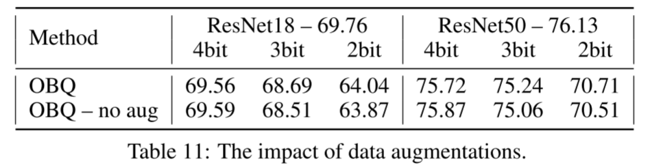 如主提交文本中所述,对于 ImageNet 实验,我们通过标准数据增强将校准集扩展了 10 倍。这主要是为了确保 ResNet50 全连接层对应的 2048×2048 Hessian 是满秩的(仅使用 1024 张图像时情况并非如此),从而避免对阻尼常数进行任何超参数调优。此外,这也应作为一个演示:增强与我们的方法结合使用时成本很低 —— 而对于其他训练后方法而言,情况并非如此,它们要么需要显著增加内存(存储更多激活),要么需要增加运行时(在逐层优化中对每个批次执行整个模型的完整推理)。