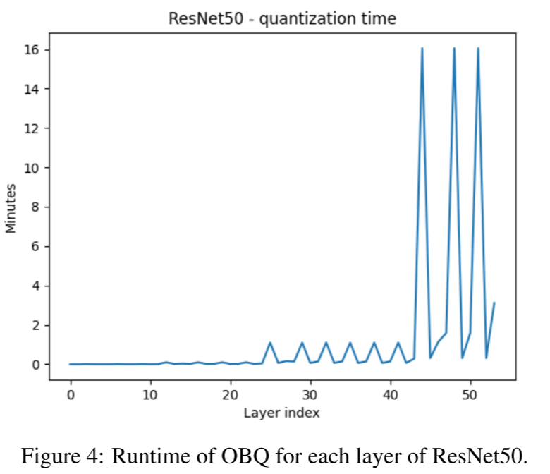最后,我们注意到,由于通过 ExactOBS 实现的 OBQ 的时间复杂度为O(drow⋅dcol3)(即与列维度的三次方成正比),因此总体运行时通常可能由少数特别大的层主导。例如,ResNet50 就是如此 —— 如图 4 所示,大约 75% 的总体运行时花费在最后一个块的 3×3 卷积上(展开时dcol≈4500),而这样的卷积总共只有 3 个。同时,大多数早期层的量化只需几秒钟即可完成。这意味着,在许多情况下,可以通过对少数几个瓶颈层应用更快但精度较低的方法,同时通过我们的技术在所有其他层上实现更精确的压缩,来显著减少总体压缩运行时。