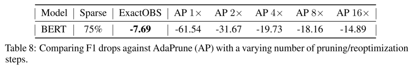 我们的结果证实了 [10] 的发现:多次迭代 AdaPrune 可以显著改善结果 —— 我们看到,仅需几次这样的 “重新计算”,F1 下降就会迅速减少。尽管如此,即使经过 16 次完整迭代(总体运行时与 ExactOBS 相当),(迭代)AdaPrune 模型的精度下降仍然几乎是 ExactOBS 的 2 倍 —— 这清楚地展示了我们方法的优势。