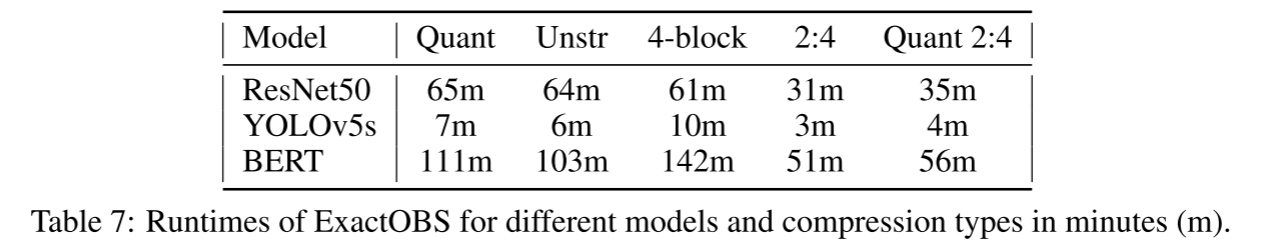 接下来,我们研究 ExactOBS 应用于不同类型压缩问题的运行时。我们考虑一个小型模型(YOLOv5s)、一个中型模型(ResNet50)和一个大型模型(BERT)。我们工作中所有压缩类型的相应运行时如表 7 所示。