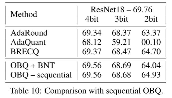 作为演示,我们将顺序 OBQ 应用于将 ResNet18 量化到各种位宽的任务(与主论文表 4 中的设置相同),结果如表 10 所示。有趣的是,对于 4 位和 3 位量化,结果与独立版本(带有批量归一化统计校正)基本相同;仅在 2 位设置下,似乎有明显的优势 —— 赶上了相应的 BRECQ 结果。对这一现象的更详细研究可能是未来工作的一个有趣方向。