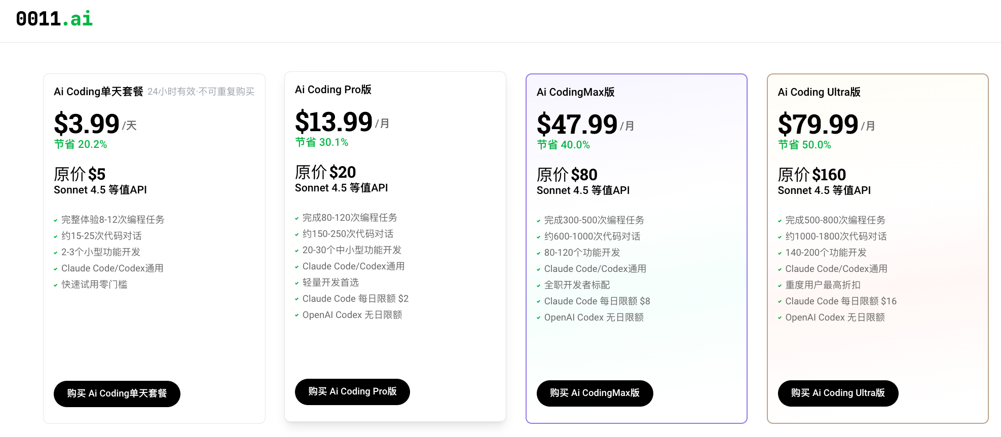 0011.ai是Claude code和Open Codex的中转服务,而且它采用的是积分模式,只要的订阅了它的会员,就可以直接使用目前全球最好用的两个AI编程工具。
