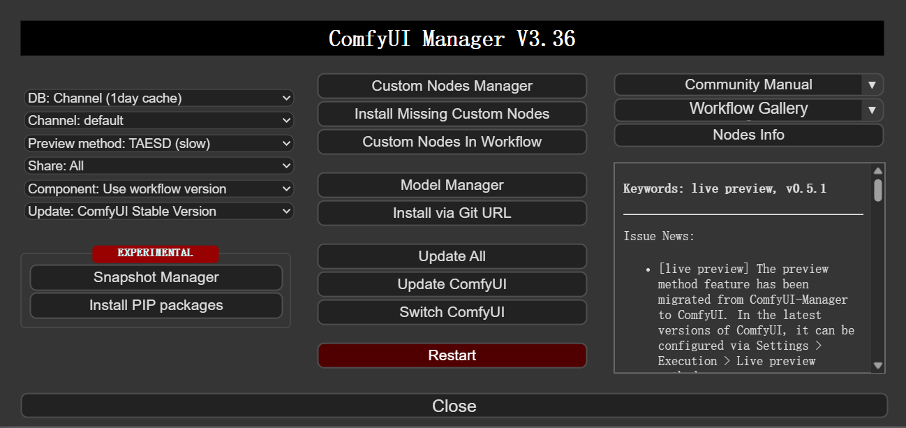 复现工作流一般会把custom_nodes,models,json文件放入本地ComfyUI文件夹,但难免出现缺失。打开ComfyUI界面后,会提示缺少的插件与模型。通过Manager管理器可以安装缺少的插件或模型。安装完成后,点击Restart后刷新网页即可。