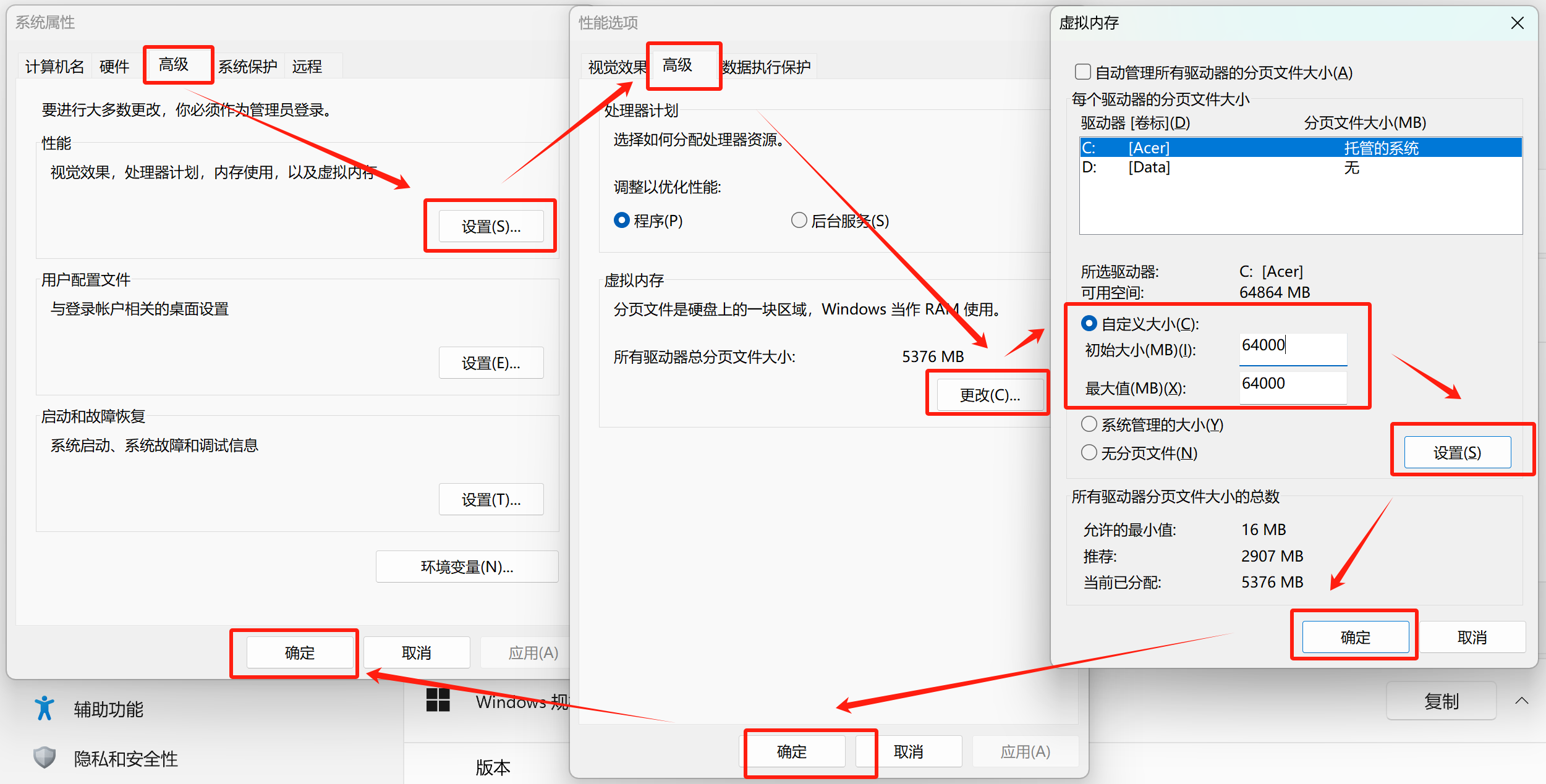 当出现OOM报错时,可以先尝试扩充自己的虚拟内存:在“高级系统设置”中,按照下图指引设置虚拟内存,具体大小可以根据自己硬盘剩余容量灵活调整,注意填完数字后,点击设置并点击3次确定,最后重启电脑完成虚拟内存设置。