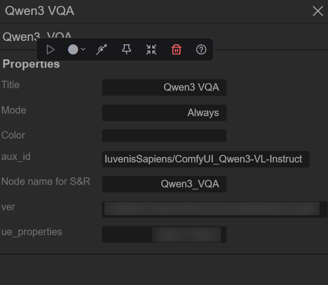 右键节点,点击“属性”或者“属性面板”,查看“aux_id”确定节点对应的插件名称“Comfyui_Qwen3-VL-Instruct”,
