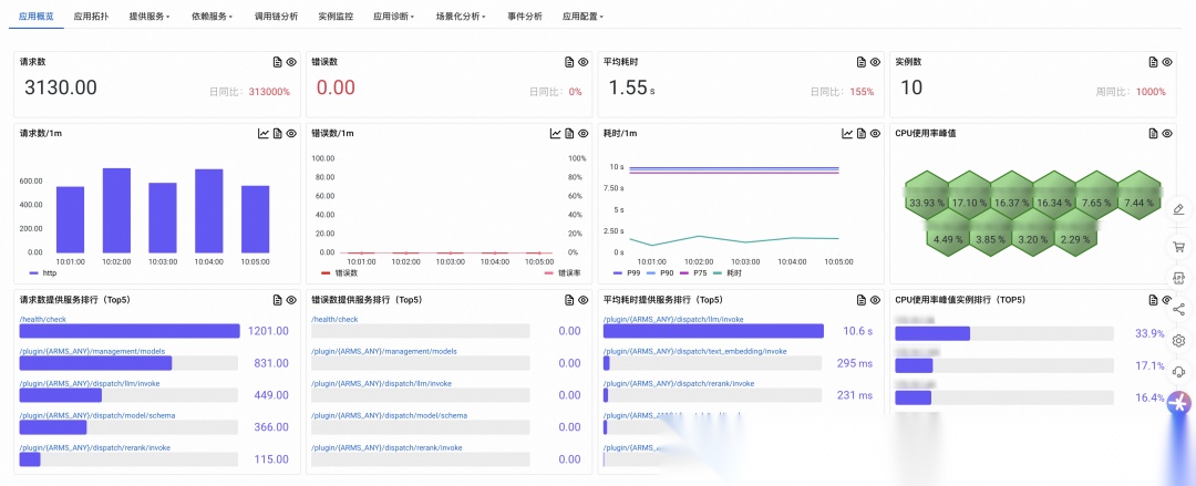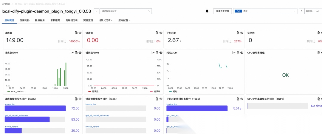 Dify 社区提供了丰富的插件生态,但管理插件的 Dify-Plugin-Daemon 和插件运行时却是难以定位故障的黑盒。在 Dify 控制台上能清晰地看到各个工作流节点的运行记录,但对于流程节点之下 Dify infra 设施的故障却无从分析。一次 Workflow 调用链路涉及 Nginx、Api、Plugin-Daemon、Plugin 运行时和模型网关等多个组件,阿里云云监控提供的全链路追踪能力可以串联上下游的完整链路,定位插件内的错慢异常。