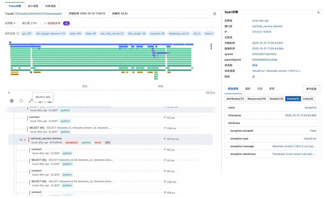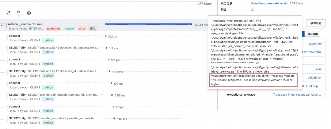 在错误 Span 的 Details 和 Events 中,可以看到错误信息和异常堆栈。并定位到根因是 Weaviate 向量存储配置引起的问题。