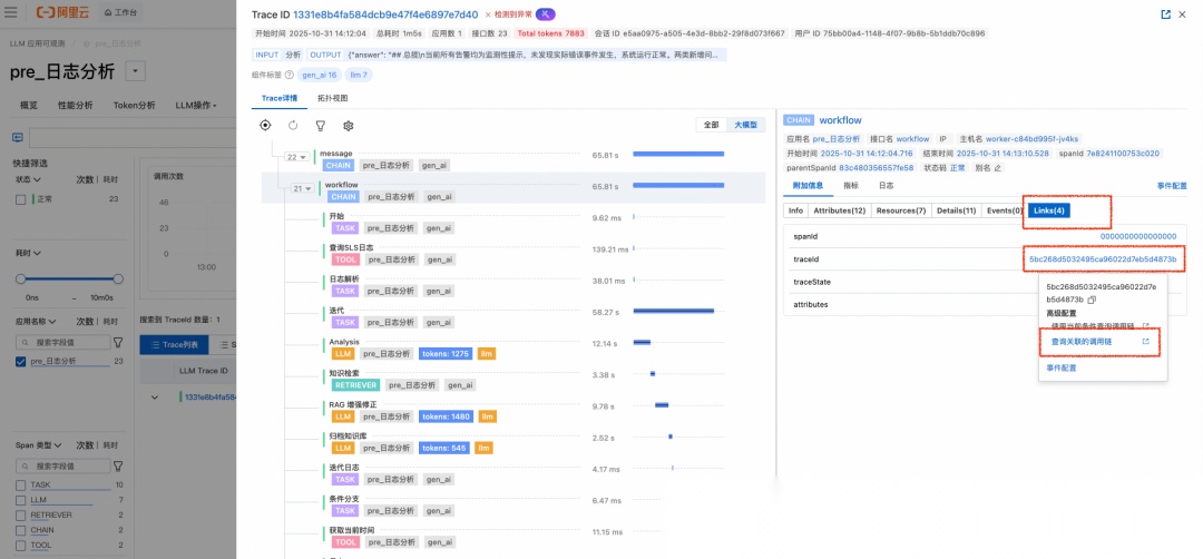 如果对应的 Workflow 开启了云监控追踪,在 span 附加信息的 Links 页签可以看到关联的 LLM Trace Id,点击“查询关联的调用链”可跳转到相应 LLM Trace。