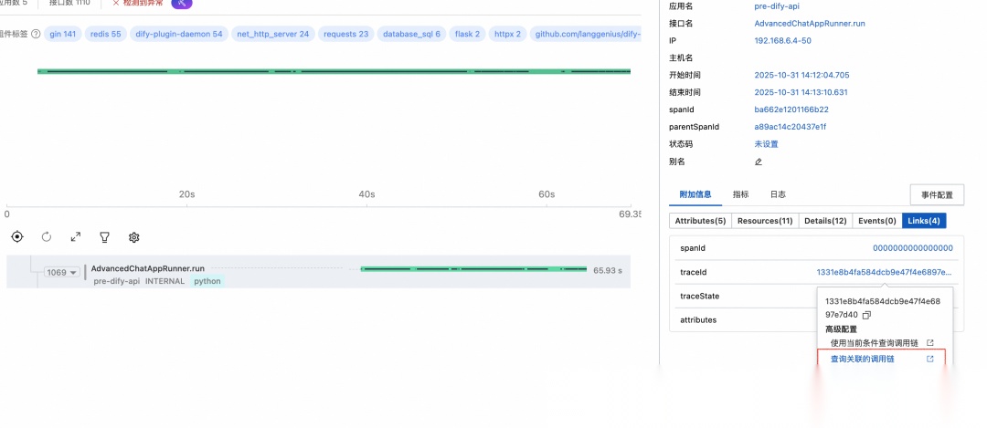 限于 Dify 框架特性,Dify 官方集成的云监控和 Python 探针采集的 Trace 无法直接联通,但可以通过 Trace Link 方式实现大模型应用和微服务应用的相关关联, 通过 Python 探针和 Dify 原生监控组合实现 Api 组件的可观测。