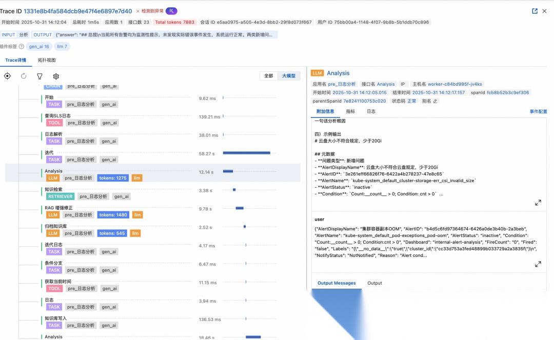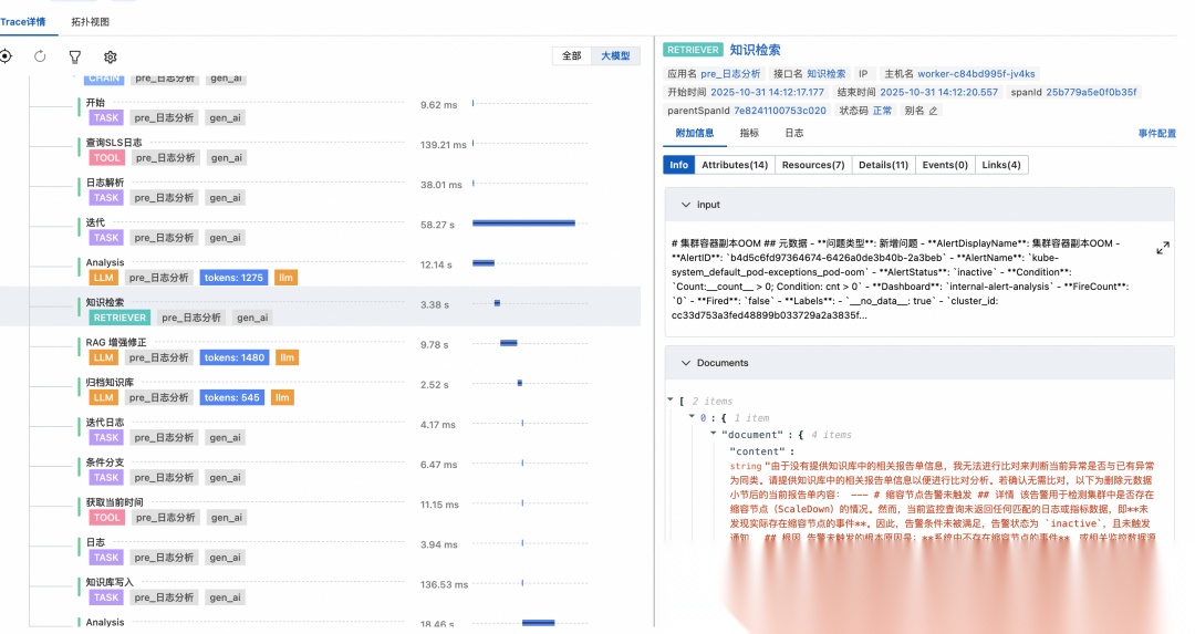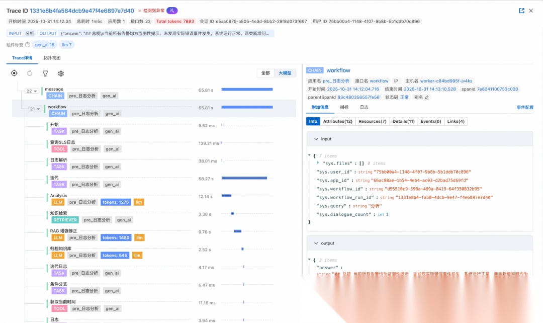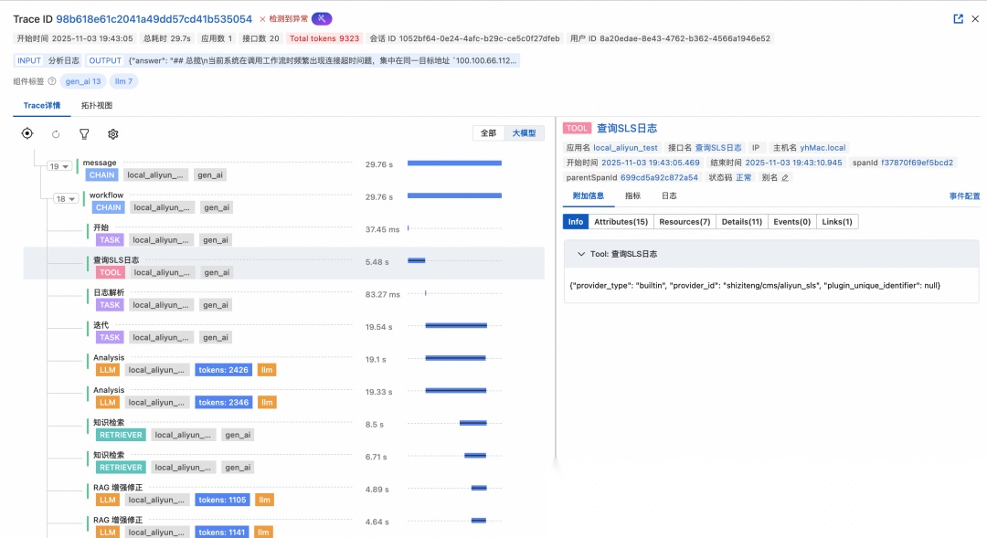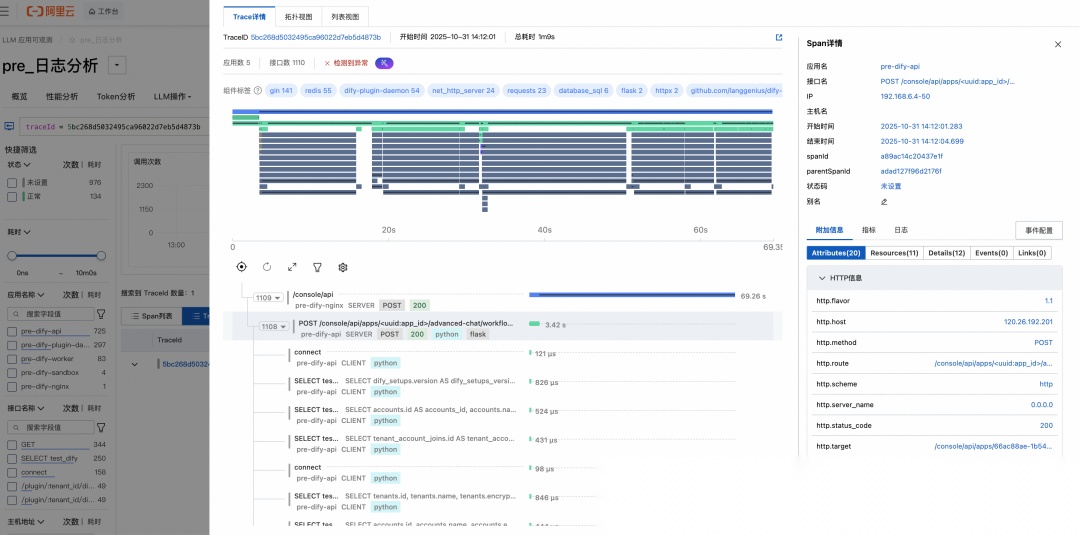 如图示例中“查询SLS日志”是一个 Dify 插件,正常调用只需 200 ms,但在这个 Trace 中却有 5 s多的慢调用。仅看 LLM Trace 或 Dify 执行日志,无法判断慢请求是因为 Dify-Api 引擎、Dify-Plugin-Daemon 插件引擎、Dify-Plugin 运行时或者 SLS 日志服务本身导致的。