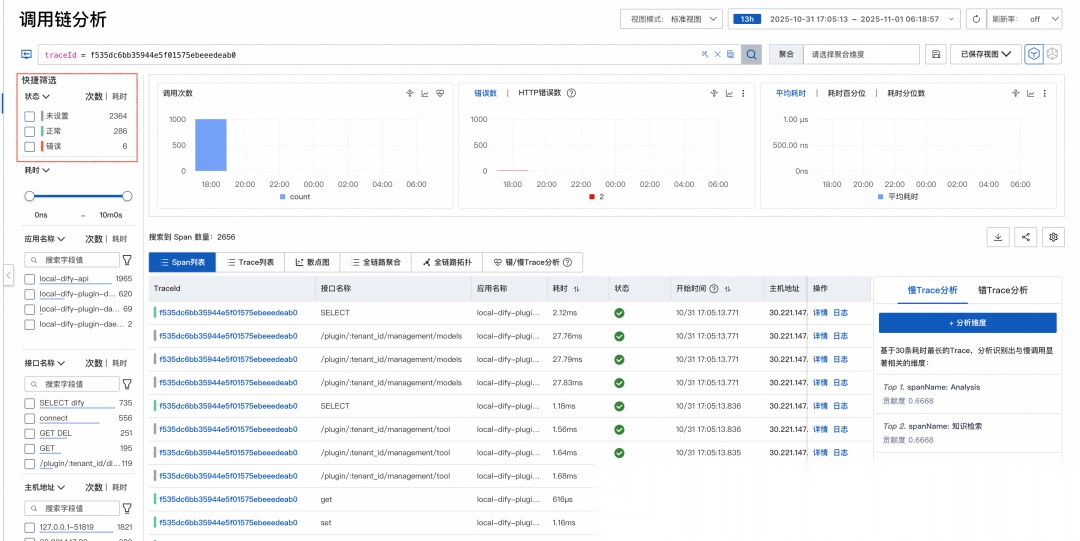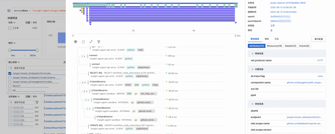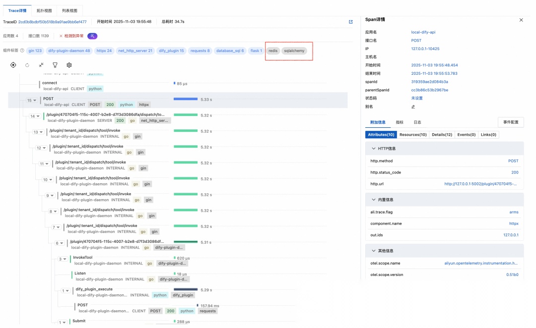 可以看到 dify 执行引擎(local-dify-api)发起了对 dify 插件引擎(local-dify-plugin-daemon)的POST 调用,插件引擎调用插件运行时(local-dify-plugin-daemon_plugin_cms_0.0.1)并转发请求给 SLS 服务端口。整个链路上耗时最长的是 dify_plugin_execute,这是插件运行时内部的入口方法,我们正是在此处注入了故障模拟的慢调用。