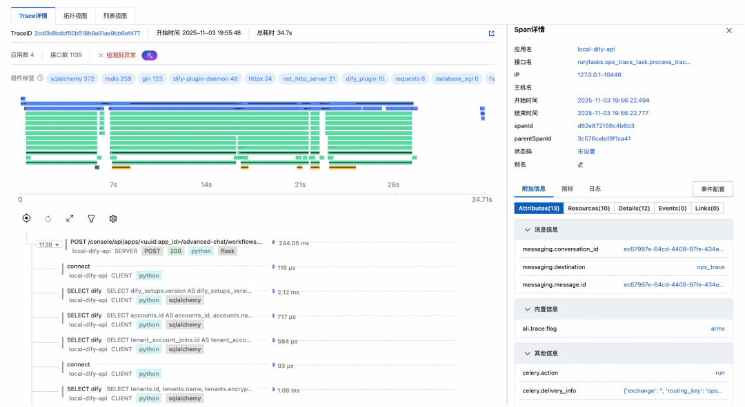 云监控采用 OTel 格式上报数据,在 Dify 引擎挂载探针时将 traceId 信息透传到后台的 Celery 任务,通过 Trace Link 方式关联 Dify 官方集成方式上报的 Workflow 执行明细数据和无侵入探针上报的全链路追踪数据,实现全景可观测。