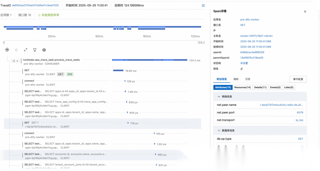 使用最新版 Python 探针即可,Dify v1.x 版本都可用,因为只采 HTTP/Flask/Redis/DB 等框架层数据,所以 Python 探针对 Dify 版本无强要求。Dify v1.8.0 以后的版本支持通过 Trace Link 方式串联 Dify 官方集成上报的 Workflow 执行明细数据。