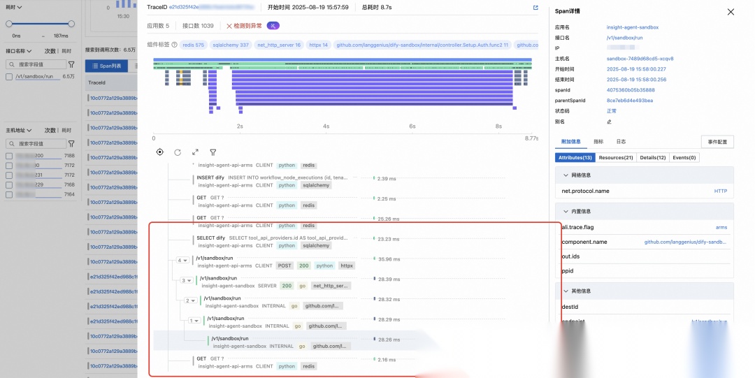 工作流层面的异常通常在 LLM Trace 或 Dify 日志追踪里可以看到直观的报错信息,但还有一类错误是底层 Dify 引擎的配置不当或内部 bug 引起的。无侵入探针提供了对这类错误的定位分析能力。