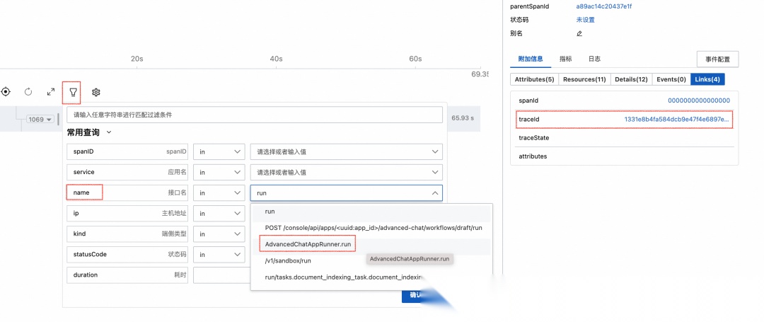 点击调用链上方的筛选功能,用 span 名称筛选,找到名称为 AdvancedChatAppRunner.run 或 WorkflowAppRunner.run 的 span。(取决于 Dify Workflow 的类型,如果调用了子 Workflow 可能会有多个这样的 span)。