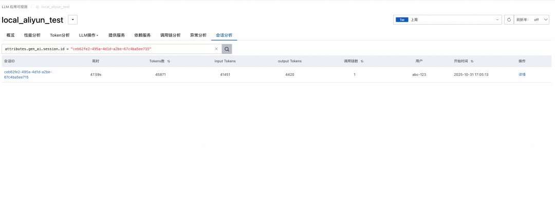 进入会话详情,找到对应 Trace 和相关 Span,首先尝试在 Span 详情中查找相关信息: