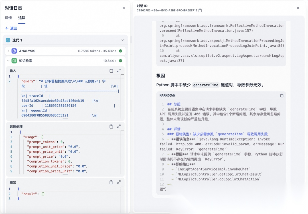 其他流程节点也都会采集节点的输入输出、会话ID、用户ID 等必要数据。