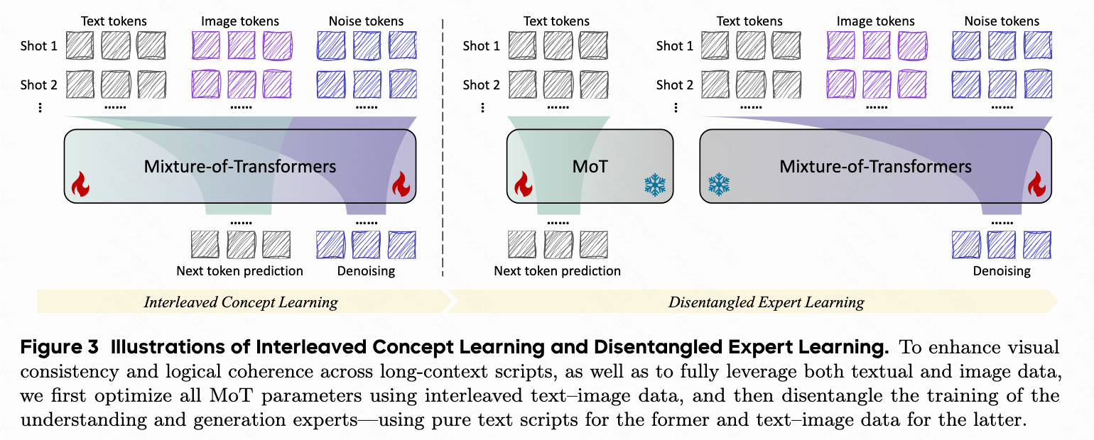 如下图3左侧所示,通过上述定义的剧本结构,剧本可以组织为交错的文本-图像数据。首先执行交错概念学习,使 MoT 模型能够以交错的方式生成文本和图像,从而促进对冗长、上下文丰富的剧本的更深入理解。这个训练阶段在概念上类似于 Chain-of-Thought 策略,其中文本内容作为模型的推理过程,随后根据前置叙事上下文生成图像。在此阶段,两个 Transformer 专家的所有参数都联合优化,允许生成结果影响模型的文本理解,反之亦然。