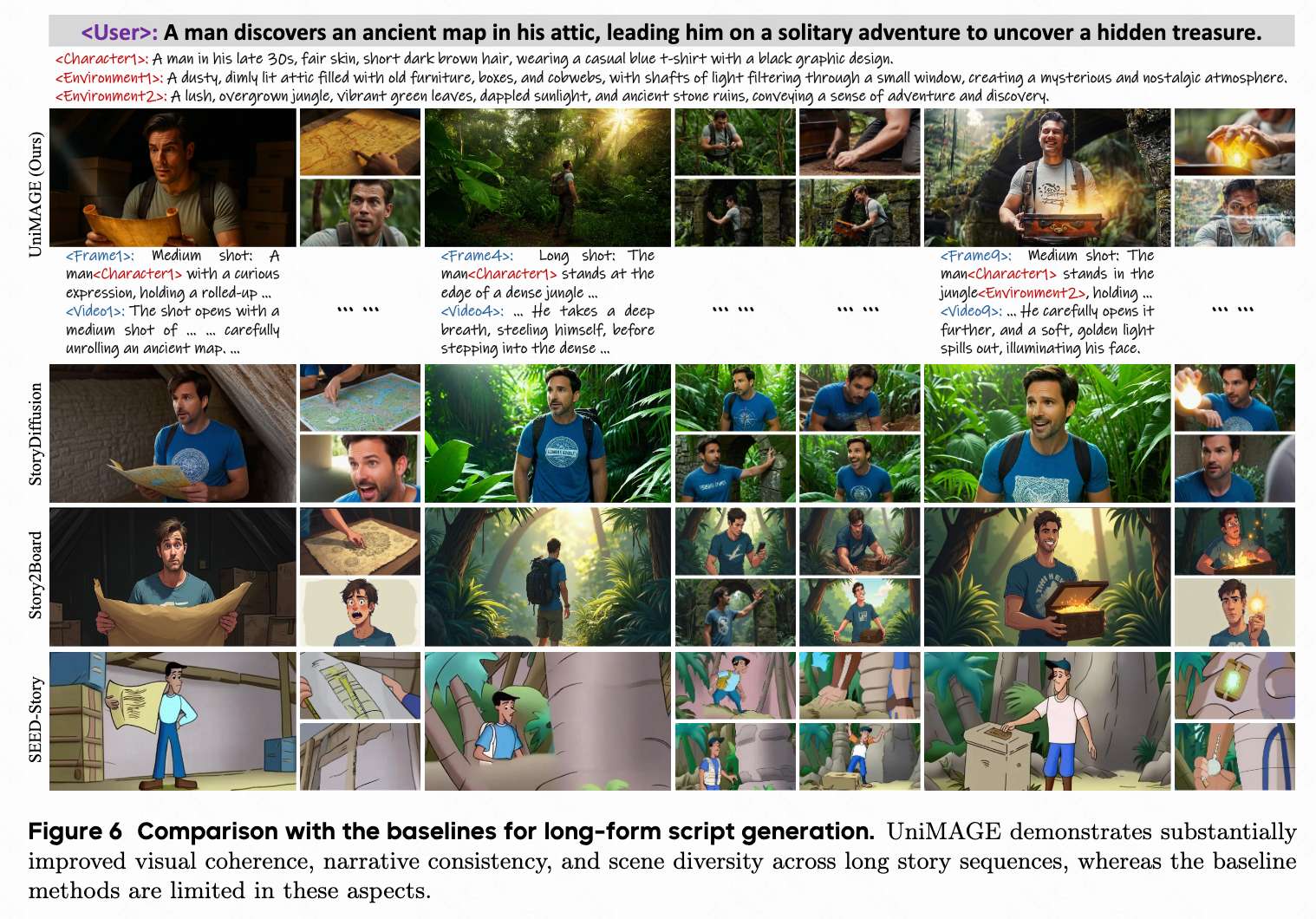 性能:UniMAGE 在长篇、多场景剧本创作中展现出强大的能力和泛化性,与现有基于代理和统一模型相比,实现了卓越的叙事连贯性、角色稳定性和图像一致性。