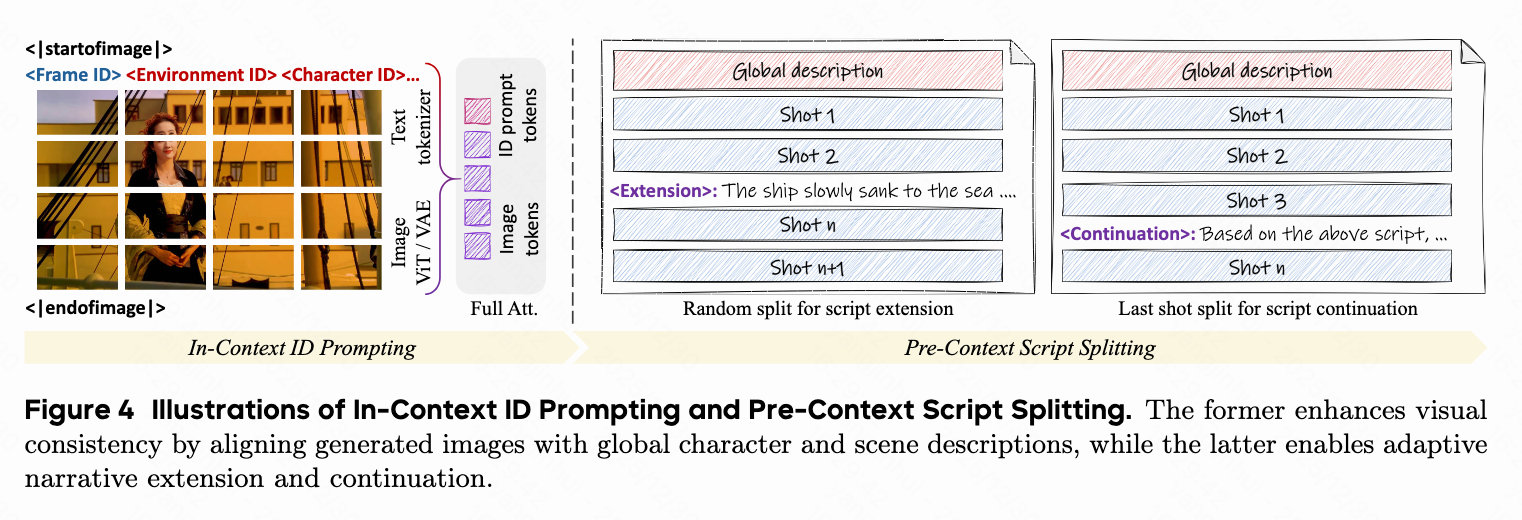 为了解决多角色和多场景的视觉一致性问题,本文提出了情境中 ID 提示 (In-Context ID Prompting) 方法。如下图4左侧所示,在用于理解的 ViT token 和用于图像引用的 VAE token 中,插入特殊的文本 token 来指示帧 ID,以及图像中出现的角色和环境 ID。在每个图像的 ViT 或 VAE token 及其相应的特殊 token 之间应用完全注意力。这种情境中 ID 提示策略,结合剧本结构中定义的特殊 token,有效地保留了剧本文本和生成图像之间的长程关联,确保了整个叙事中一致的视觉身份和场景连续性。