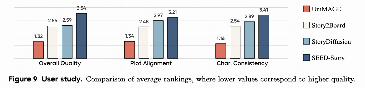 如下图9所示,用户研究表明,UniMAGE 在所有标准中都获得了最高的偏好,包括叙事逻辑的 GSB 分数为 0.72,这表明在长篇故事连贯性方面具有明显优势。这些结果证实,大多数参与者更喜欢 UniMAGE 生成的剧本,而不是现有基线生成的剧本。