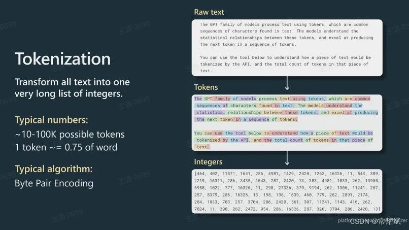 中文的每个字,被理解为是文本的一个基本单位,翻译成不同的token。是指将输入文本分解为更小的单位,例如单词、字母或字符。在自然语言处理中,将文本分解为标记有助于模型理解语义和语法结构。当一个Prompt被发送给GPT时,它会被分解成多个Token,这个过程被称为Tokenier。短单词可能每个词是一个token,长单词可能被拆成多个token。每个token会被用一个整数数字表示,这个数字被叫做token ID。这是因为,计算机内部是无法储存文字的,任何字符最终都得用数字来表示。有了数字表示的输入文本后,再把它传入嵌入层。如下是官网提供的Tokenization示意图。