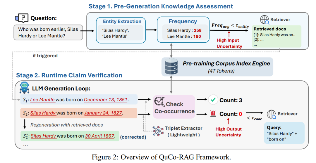 基于共现统计的动态 RAGQuCo-RAG 是一种动态 RAG 方法,它根据模型预训练数据的统计信息(而非模型自信度)来决定何时检索信息。它会标记罕见或可疑的实体,并检查它们是否在真实数据中共现(Co-occur),从而触发检索以减少幻觉并提高事实准确性。