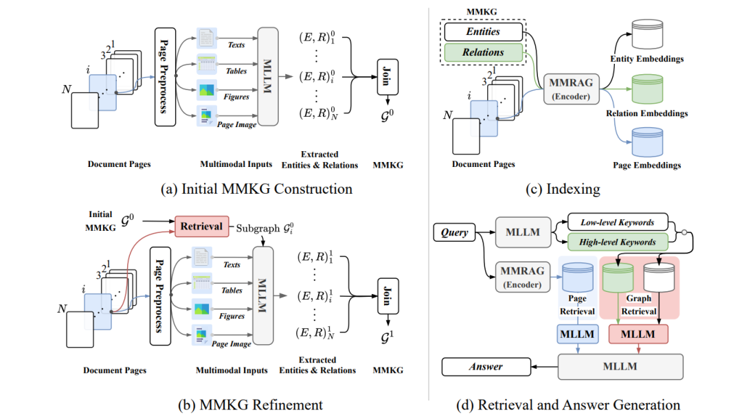 MegaRAG 专为书籍等长文档构建,围绕多模态知识图谱设计。它从文本和视觉内容中提取实体和关系,构建分层图谱,并在检索和生成过程中使用它。这有助于模型进行全局推理,更准确地回答文本和视觉问题。