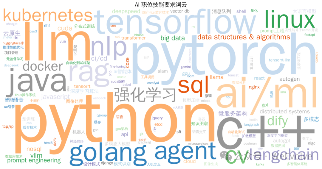 Python, PyTorch, LLM, Agent, RAG, LangChain, Docker, K8s, API, C++, Java, Go, NLP, CV, Cloud这些词会非常醒目。这清晰地告诉我们,现在的AI人才,既要有扎实的算法理论基础,也要有强大的工程实践能力,并且需要紧跟大模型和Agent这些最新的技术浪潮。