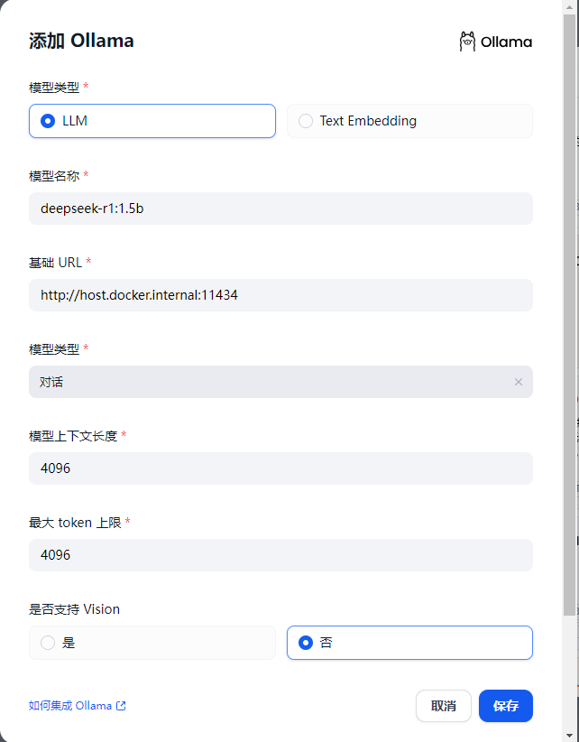 基础URL填 http://host.docker.internal:11434
