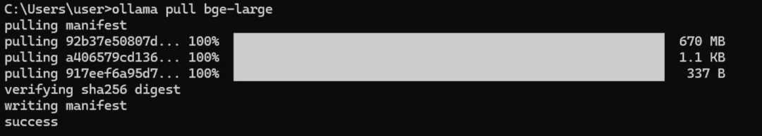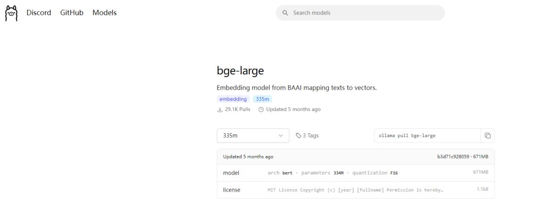 同时在ollama中搜索bge-large。点击进入后复制命令