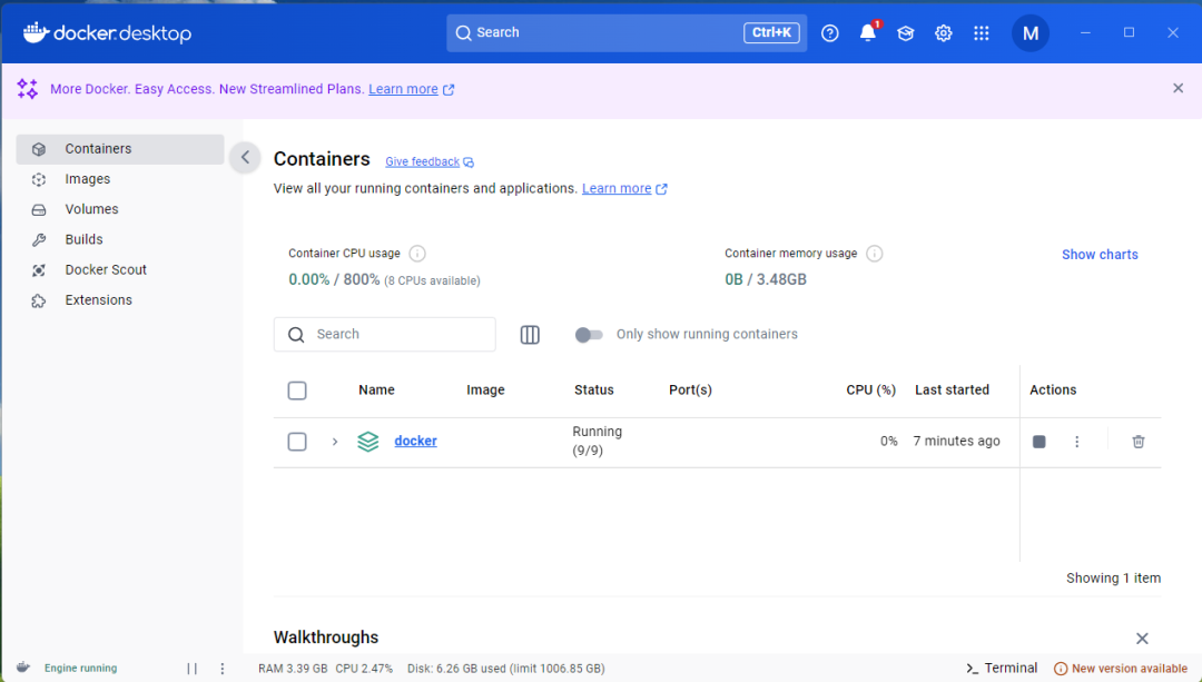 重启docker 桌面软件,在containers中能看到docker的这个image,表示Dify下载成功。Status显示Running表示正在运行。