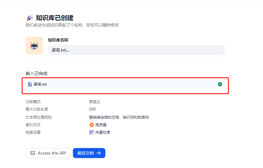 会进行知识库的创建,显示嵌入已完成。代表知识库导入成功