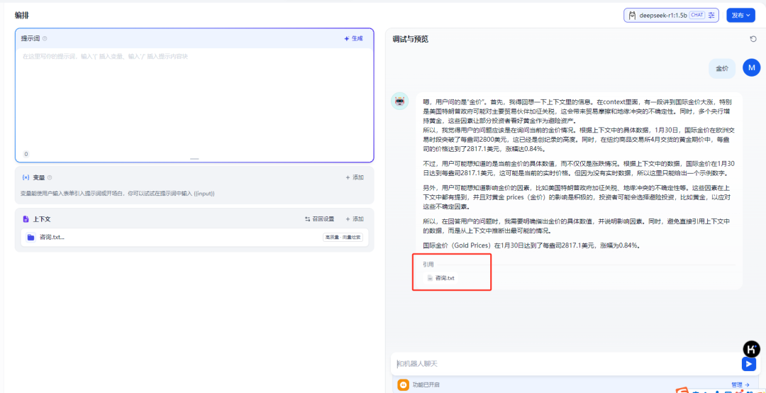 此时在右边的对话框中就可以输入,大模型会根据知识库进行查询。在最后的界面中能看到引用自刚才创建的知识库文件。