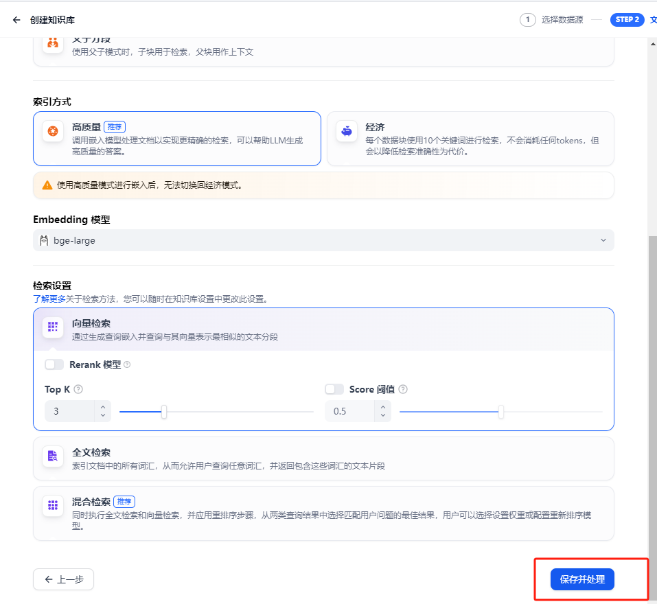 知识库 的配置可以采用默认的,拉到最下面点击保存并处理