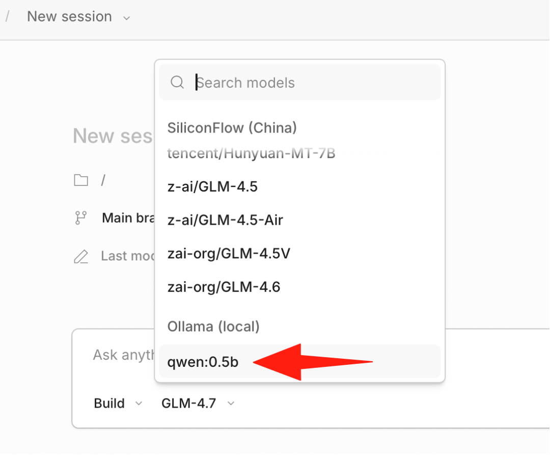 在新的会话窗口,模型选择那里就可以看到 Ollama 启动的 qwen:0.5b 了