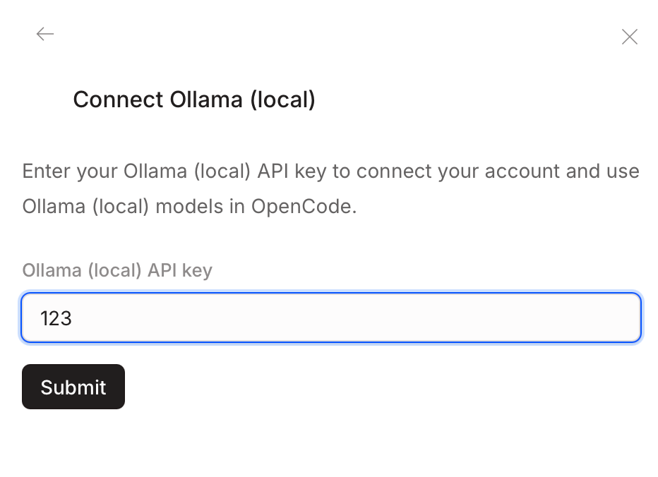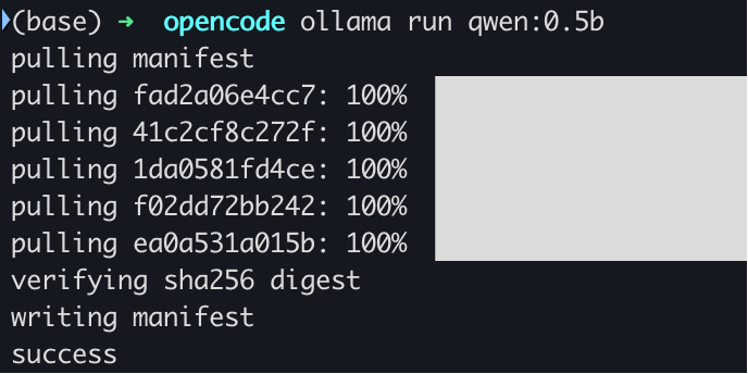 { "$schema": "https://opencode.ai/config.json","provider": { "ollama": { "npm": "@ai-sdk/openai-compatible", "name": "Ollama (local)", "options": { "baseURL": "http://localhost:11434/v1" }, "models": { "qwen:0.5b": { "name": "qwen:0.5b" } } } }}