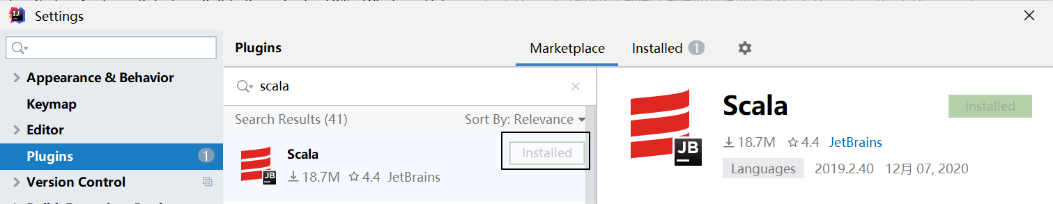打开 File -> Settings -> Plugins 选择 Marketplace 商店,输入 scala 回车,如下: