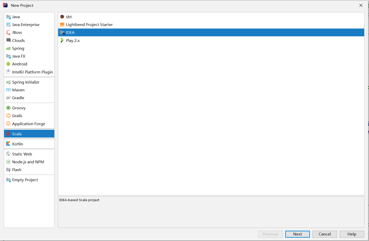 - 创建新工程(New Project),选择 Scala -> IDEA,如下: