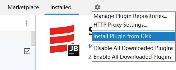 下载完成后,打开 File -> Settings -> Plugins 点击设置图标,下拉列表中选择 Install Plugin from Disk… ,选择下载的 Scala 插件完成插件安装